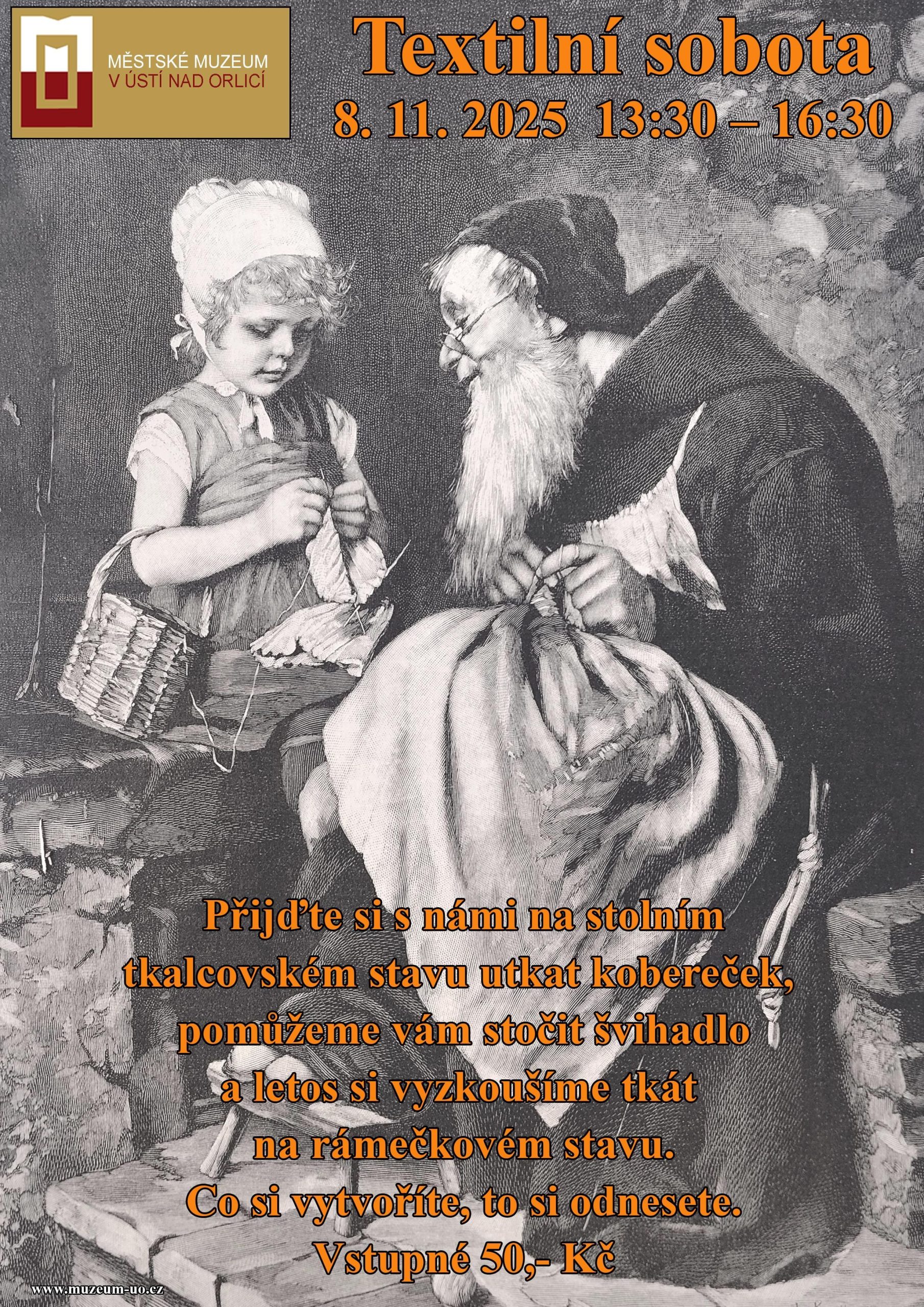 V sobotu 8. listopadu 2025 od 13.30 do 16.30 hodin si můžete vlastnoručně vyzkoušet předení, skaní a tkaní. můžete si na stolním tkalcovskémstavu utkat kobereček. Co si vytvoříte, to si odnesete.