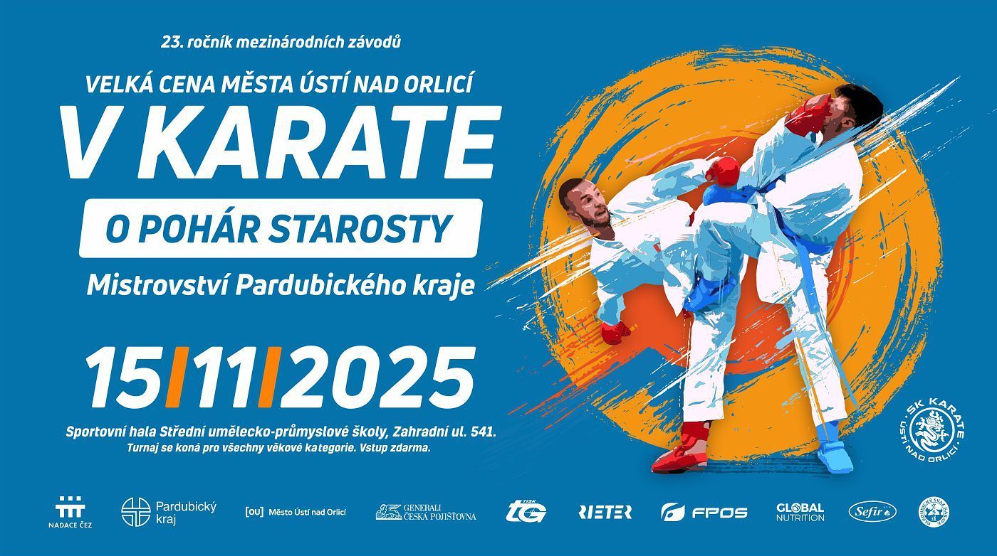 V sobotu 15. listopadu 2025 od 9 hodin se koná 23. ročník mezinárodního turnaje v karate VELKÁ CENA MĚSTA ÚSTÍ NAD ORLICÍ O POHÁR STAROSTY. Místo konání: sportovní hala Střední umělecko-průmyslové školy v Ústí nad Orlicí.
