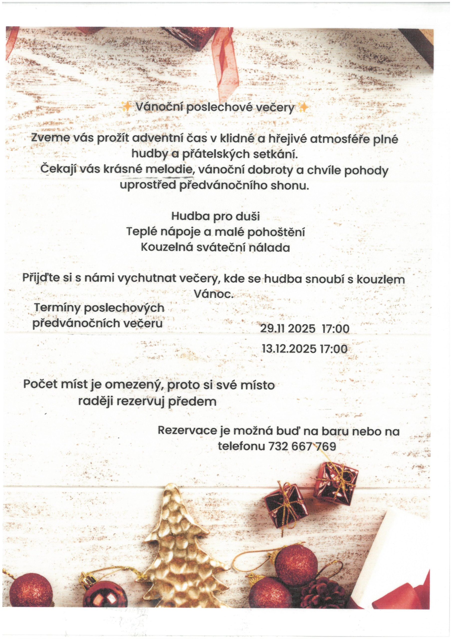 V sobotu 13. prosince 2025 od 17 hodin Vás zveme na Vánoční poslechový večer ve Vitalu v Ústí nad Orlicí. Čekají Vás krásné melodie, vánoční dobroty a chvíle pohody.