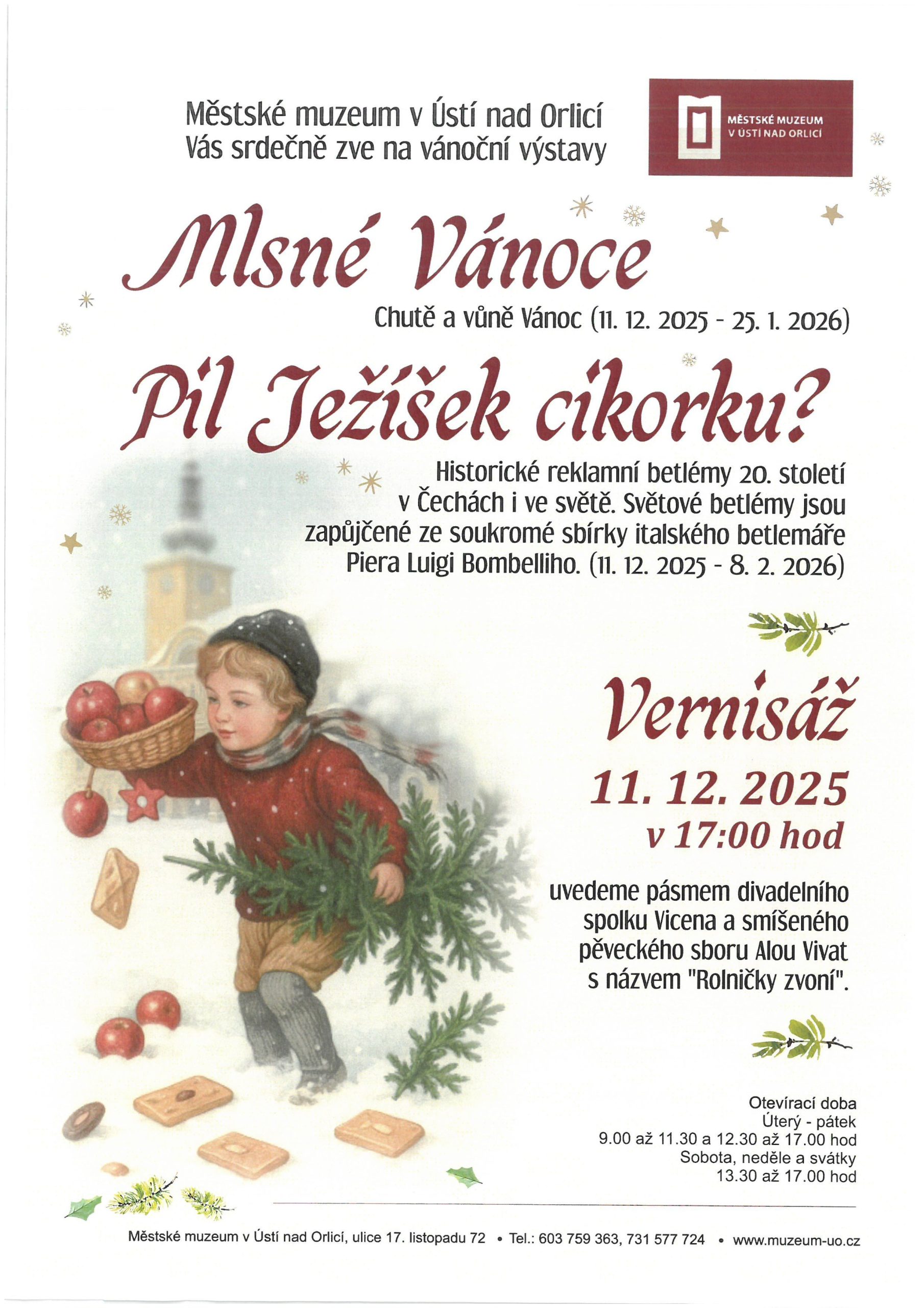 Srdečně Vás zveme na výstavy do Městského muzea v Ústí nad Orlicí. Od 11. prosince 2025 do 25. ledna 2026 Mlsné Vánoce – chutě a vůně Vánoc, od 11. prosince 2025 do 8. února 2026 výstava Pil Ježíšek cikorku? – historické reklamní betlémy 20. století v Čechách i ve světě.