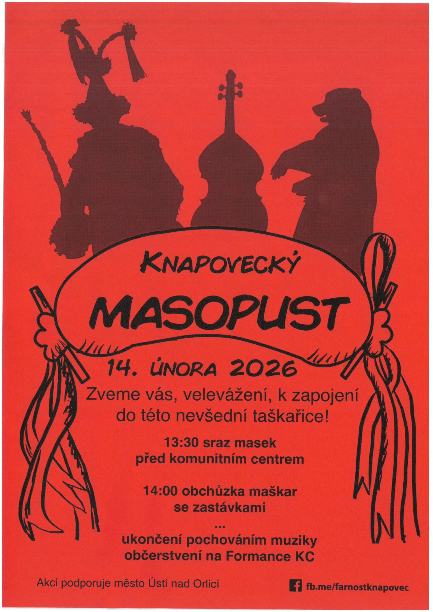 V sobotu 14. února 2026 Vás zveme na nevšední taškařici do Knapovce. Ve 13.30 sraz masek před komunitním centrem, ve14.00 obchůzka maškar se zastávkami. Ukončení pochováním muziky, občerstvení na Formance.